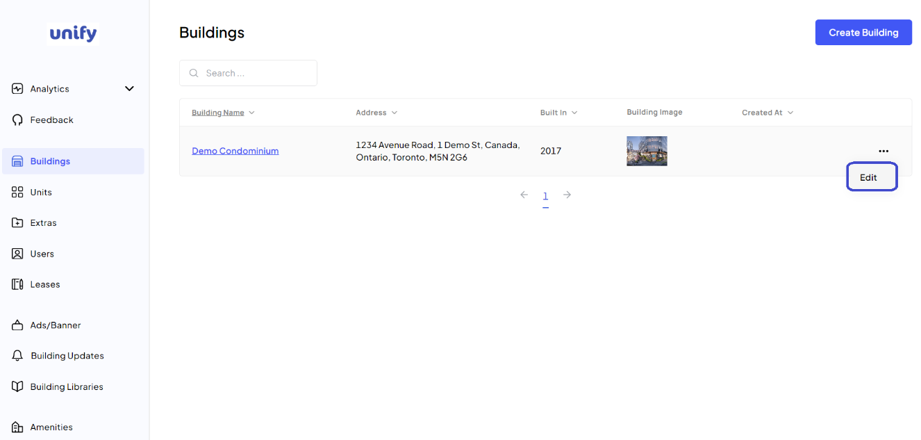 2. Begin Editing: Select Edit from the dropdown menu to start modifying the building's information. This action will take you to the editing page, where you can update details such as the building’s name, address, and other pertinent information.