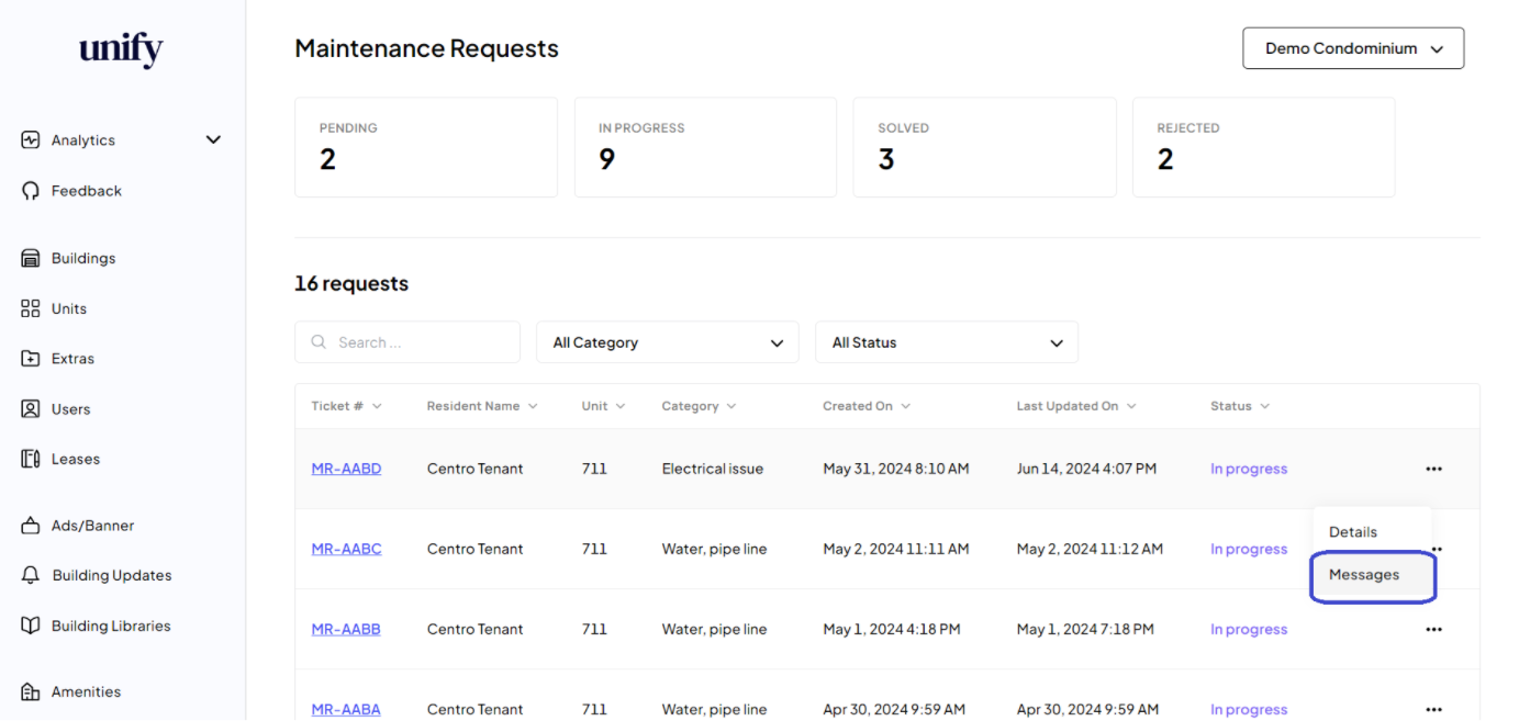 Click on the Action Menu next to the request and select Messages.