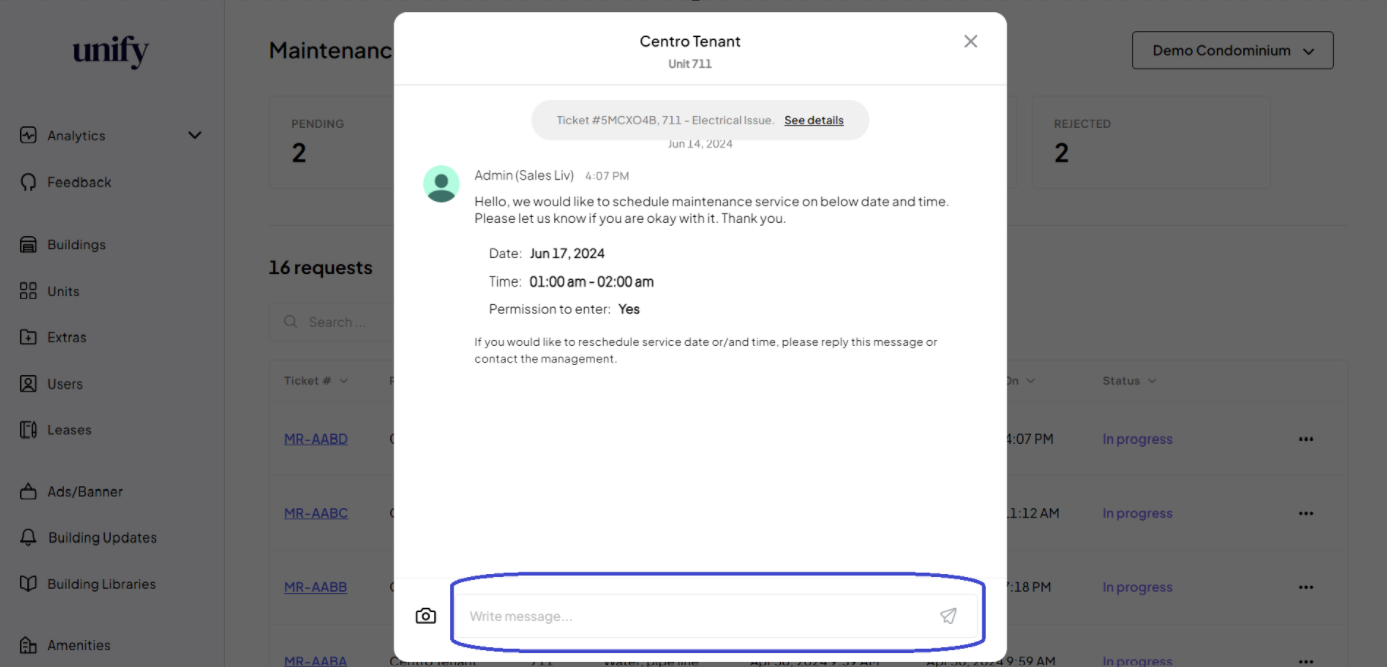 Your message has been sent to the tenant regarding the Maintenance Request.