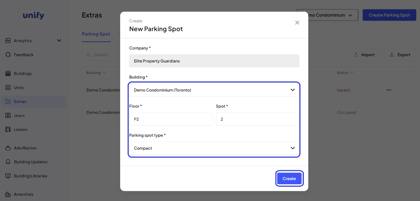 Creating a new parking spot helps efficiently manage building parking facilities.