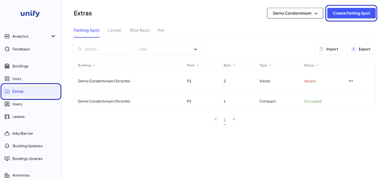 Click on the "Create Parking Spot" button.