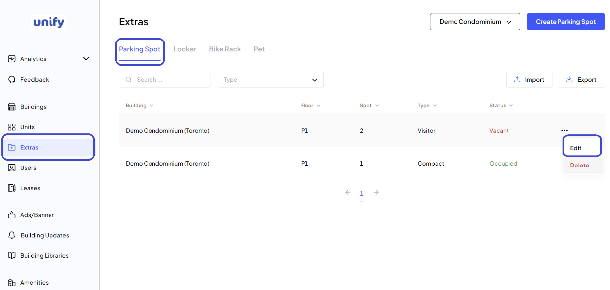 Click on the Action Menu (three dots icon) next to the parking spot and select Edit.