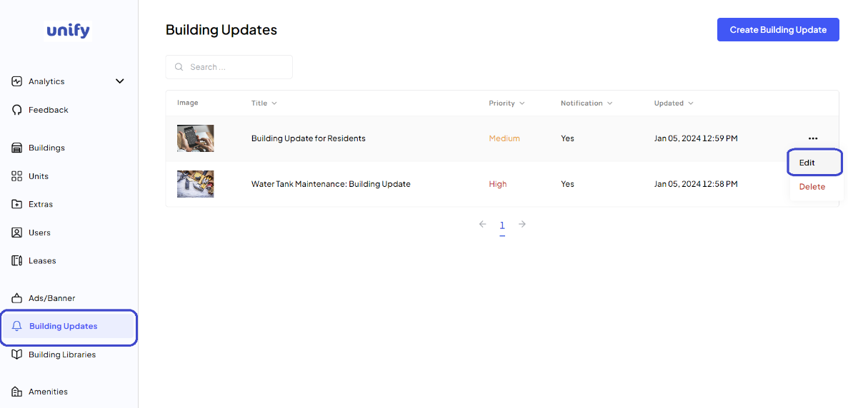 Choose Edit from the dropdown menu to start modifying the Building Update. This action will lead you to the editing page, where you can make changes to the content, title, or associated images.