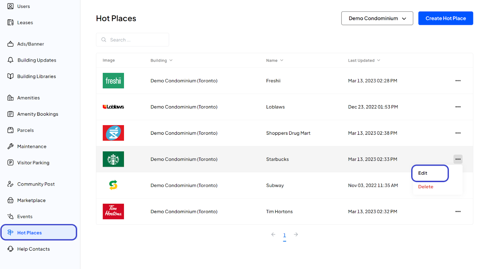 After logging in, click on the Action Menu (three dots icon) next to the Hot Place you want to update and select Edit.