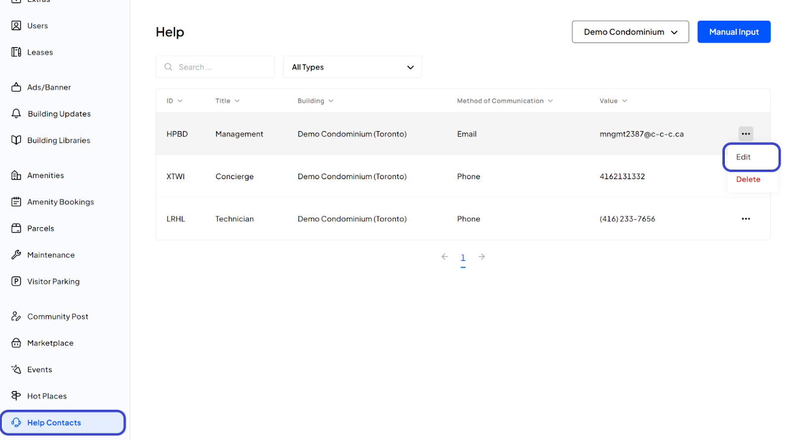 After Logging in, click on the Action Menu (three dots icon) next to the Help Contact you want to update and select Edit.